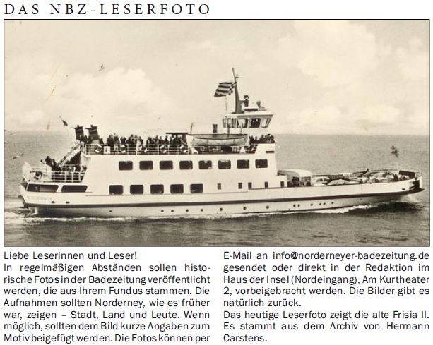 Das heutige Leserfoto zeigt die alte Frisia II. Es stammt aus dem Archiv von Hermann Carstens.