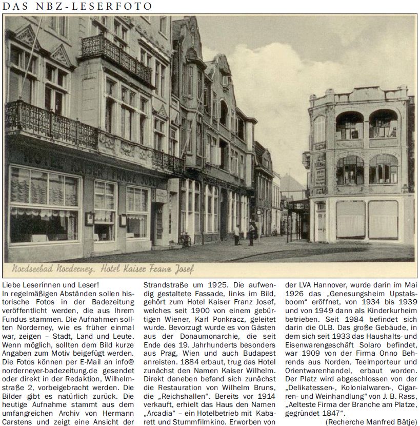 Die heutige Aufnahme stammt aus dem umfangreichen Archiv von Hermann Carstens und zeigt eine Ansicht der Strandstraße um 1925. Die aufwendig gestaltete Fassade, links im Bild, gehört zum Hotel Kaiser Franz Josef, welches seit 1900 von einem gebürtigen Wiener, Karl Ponkracz, geleitet wurde. Bevorzugt wurde es von Gästen aus der Donaumonarchie, die seit Ende des 19. Jahrhunderts besonders aus Prag, Wien und auch Budapest anreisten. 1884 erbaut, trug das Hotel zunächst den Namen Kaiser Wilhelm. Direkt daneben befand sich zunächst die Restauration von Wilhelm Bruns, die "Reichshallen". Bereits vor 1914 verkauft, erhielt das Haus den Namen "Arcadia" - ein Hotelbetrieb mit Kabarett und Stummfilmkino. Erworben von der LVA Hannover, wurde darin im Mai 1926 das "Genesungsheim Upstalsboom" eröffnet, von 1934 bis 1939 und von 1949 dann als Kinderkurheim betrieben. Seit 1984 befindet sich darin die OLB. Das große Gebäude, in dem sich seit 1933 das Haushalts- und Eisenwarengeschäft Solaro befindet, war 1909 von der Firma Onno Behrends aus Norden, Teeimporteur und Orientwarenhandel, erbaut worden. Der Platz wird abgeschlossen von der "Delikatessen-, Kolonialwaren-, Cigarren- und Weinhandlung" von J. B. Rass, "Aelteste Firma der Branche am Platze, gegründet 1847". (Recherche Manfred Bätje)