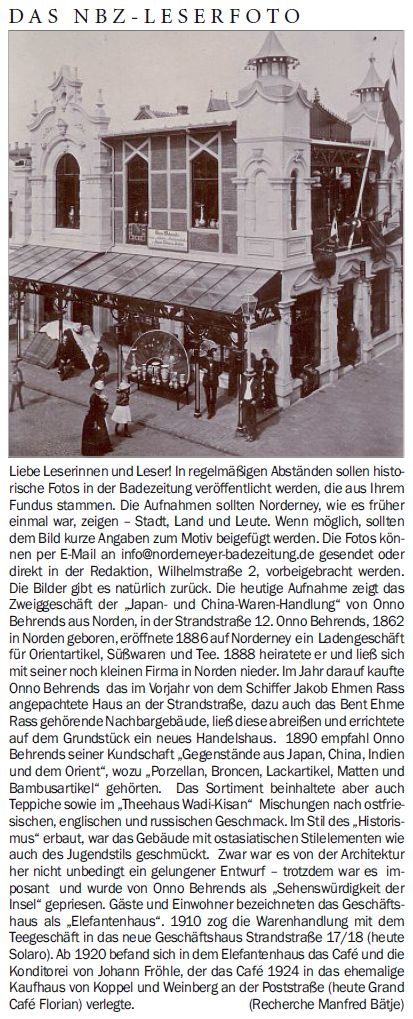 Die heutige Aufnahme zeigt das Zweiggeschäft der "Japan- und China-Waren-Handlung" von Onno Behrends aus Norden, in der Strandstraße 12. Onno Behrends, 1862 in Norden geboren, eröffnete1886 auf Norderney ein Ladengeschäft für Orientartikel, Süßwaren und Tee. 1888 heiratete er und ließ sich mit seiner noch kleinen Firma in Norden nieder. Im Jahr darauf kaufte Onno Behrends das im Vorjahr von dem Schiffer Jakob Ehmen Rass angepachtete Haus an der Strandstraße, dazu auch das Bent Ehme Rass gehörende Nachbargebäude, ließ diese abreißen und errichtete auf dem Grundstück ein neues Handelshaus. 1890 empfahl Onno Behrends seiner Kundschaft "Gegenstände aus Japan, China, Indien und dem Orient", wozu "Porzellan, Broncen, Lackartikel, Matten und Bambusartikel" gehörten. Das Sortiment beinhaltete aber auch Teppiche sowie im "Theehaus Wadi-Kisan" Mischungen nach ostfriesischen, englischen und russischen Geschmack. Im Stil des "Historismus" erbaut, war das Gebäude mit ostasiatischen Stilelementen wie auch des Jugendstils geschmückt. Zwar war es von der Architektur her nicht unbedingt ein gelungener Entwurf - trotzdem war es imposant und wurde von Onno Behrends als "Sehenswürdigkeit der Insel" gepriesen. Gäste und Einwohner bezeichneten das Geschäftshaus als "Elefantenhaus". 1910 zog die Warenhandlung mit dem Teegeschäft in das neue Geschäftshaus Strandstraße 17/18 (heute Solaro). Ab 1920 befand sich in dem Elefantenhaus das Café und die Konditorei von Johann Fröhle, der das Café 1924 in das ehemalige Kaufhaus von Koppel und Weinberg an der Poststraße (heute Grand Café Florian) verlegte. (RechercheManfred Bätje)