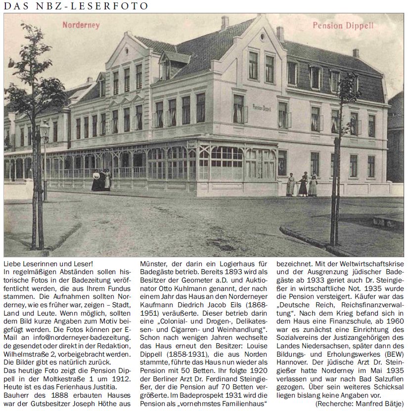 Das heutige Foto zeigt die Pension Dippell in der Moltkestraße 1 um 1912. Heute ist es das Ferienhaus Justitia. Bauherr des 1888 erbauten Hauses war der Gutsbesitzer Joseph Höthe aus Münster, der darin ein Logierhaus für Badegäste betrieb. Bereits 1893 wird als Besitzer der Geometer a.D. und Auktionator Otto Kuhlmann genannt, der nach einem Jahr das Haus an den Norderneyer Kaufmann Diedrich Jacob Eils (1868-1951) veräußerte. Dieser betrieb darin eine "Colonial- und Drogen-, Delikatessen-und Cigarren- und Weinhandlung". Schon nach wenigen Jahren wechselte das Haus erneut den Besitzer: Louise Dippell (1858-1931), die aus Norden stammte, führte das Haus nun wieder als Pension mit 50 Betten. Ihr folgte 1920 der Berliner Arzt Dr. Ferdinand Steingießer, der die Pension auf 70 Betten vergrößerte. Im Badeprospekt 1931 wird die Pension als "vornehmstes Familienhaus" bezeichnet. Mit der Weltwirtschaftskrise und der Ausgrenzung jüdischer Badegäste ab 1933 geriet auch Dr. Steingießer in wirtschaftliche Not. 1935 wurde die Pension versteigert. Käufer war das "Deutsche Reich, Reichsfinanzverwaltung". Nach dem Krieg befand sich in dem Haus eine Finanzschule, ab 1960 war es zunächst eine Einrichtung des Sozialvereins der Justizangehörigen des Landes Niedersachsen, später dann des Bildungs- und Erholungswerkes (BEW) Hannover. Der jüdische Arzt Dr. Steingießer hatte Norderney im Mai 1935 verlassen und war nach Bad Salzuflen gezogen. Über sein weiteres Schicksal liegen bislang keine Angaben vor. (Recherche: Manfred Bätje)