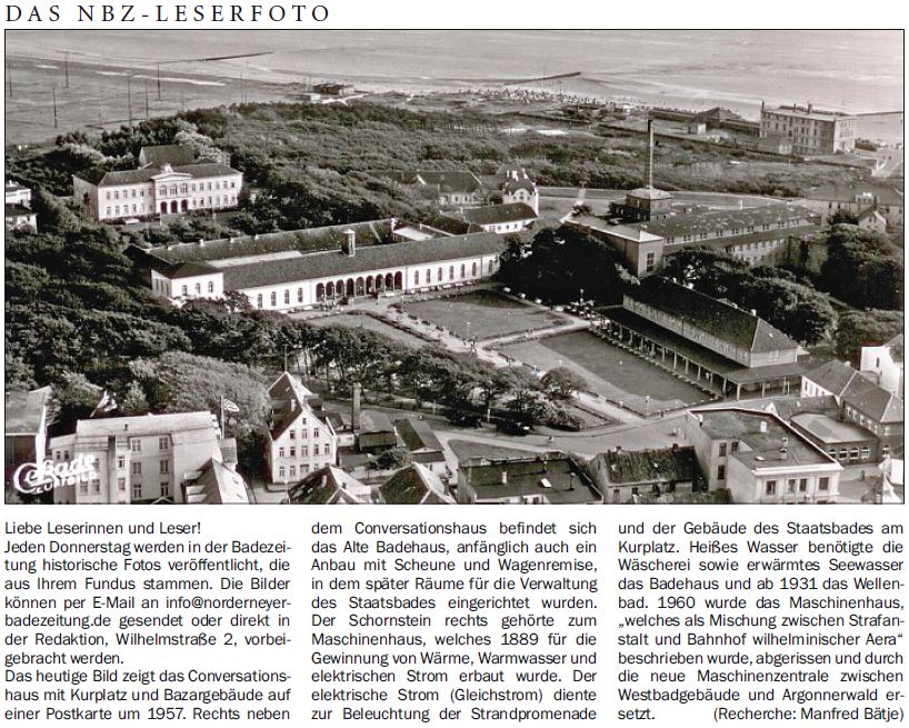 Das heutige Bild zeigt das Conversationshaus mit Kurplatz und Bazargebäude auf einer Postkarte um 1957. Rechts neben dem Conversationshaus befindet sich das Alte Badehaus, anfänglich auch ein Anbau mit Scheune und Wagenremise, in dem später Räume für die Verwaltung des Staatsbades eingerichtet wurden. Der Schornstein rechts gehörte zum Maschinenhaus, welches 1889 für die Gewinnung von Wärme, Warmwasser und elektrischen Strom erbaut wurde. Der elektrische Strom (Gleichstrom) diente zur Beleuchtung der Strandpromenade und der Gebäude des Staatsbades am Kurplatz. Heißes Wasser benötigte die Wäscherei sowie erwärmtes Seewasser das Badehaus und ab 1931 das Wellenbad. 1960 wurde das Maschinenhaus, "welches als Mischung zwischen Strafanstalt und Bahnhof wilhelminischer Aera" beschrieben wurde, abgerissen und durch die neue Maschinenzentrale zwischen Westbadgebäude und Argonnerwald ersetzt. (Recherche: Manfred Bätje)