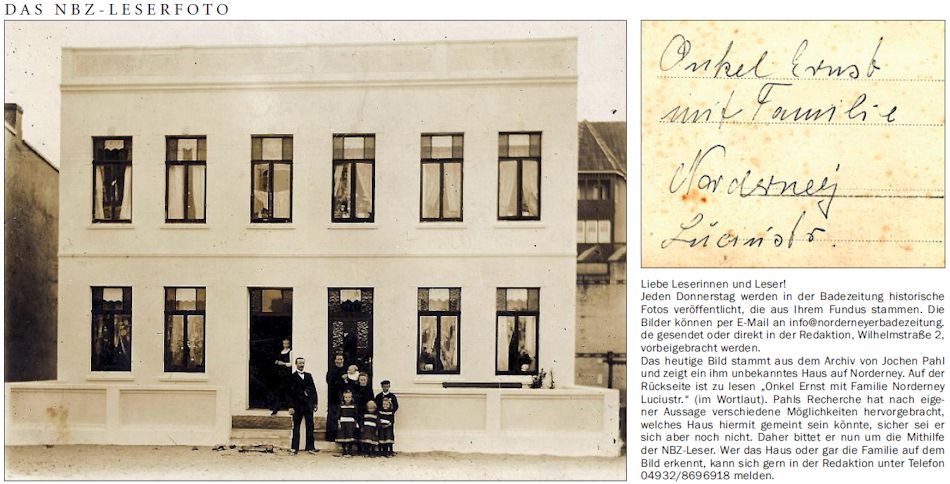 Das heutige Bild stammt aus dem Archiv von Jochen Pahl und zeigt ein ihm unbekanntes Haus auf Norderney. Auf der Rückseite ist zu lesen "Onkel Ernst mit Familie Norderney Luciustr." (im Wortlaut). Pahls Recherche hat nach eigener Aussage verschiedene Möglichkeiten hervorgebracht, welches Haus hiermit gemeint sein könnte, sicher sei er sich aber noch nicht. Daher bittet er nun um die Mithilfe der NBZ-Leser.