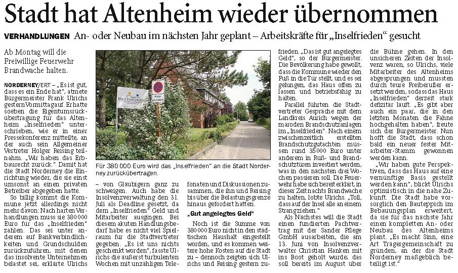 Insolvenzantrag der APA GmbH, Betreiberin des Alten- und Pflegeheims Inselfrieden auf Norderney.