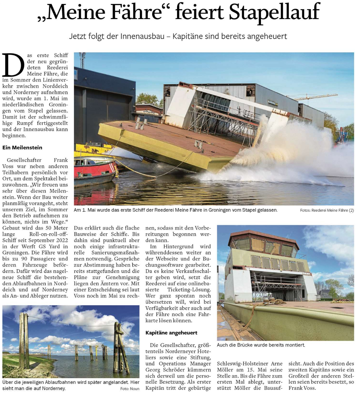 Am 1. Mai erfolgt der Stapellauf des ersten Schiffes der Reedere "Meine Fähre" in Groningen.