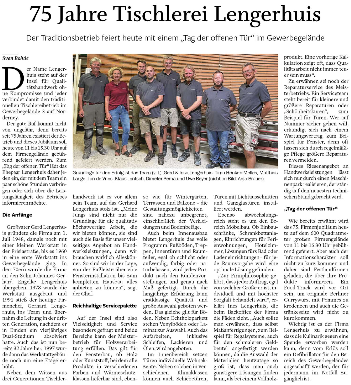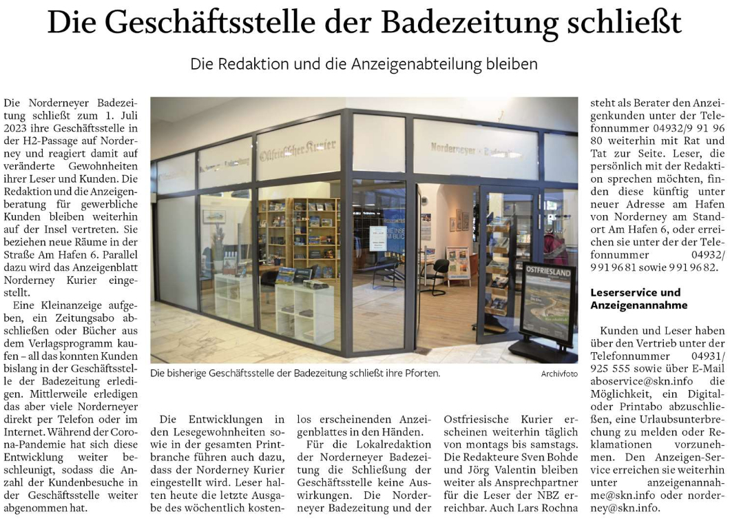 Schließung der Geschäftsstelle der Norderneyer Badezeitung zum 30.06. Gleichzeitig letzte Ausgabe des Norderney Kuriers.