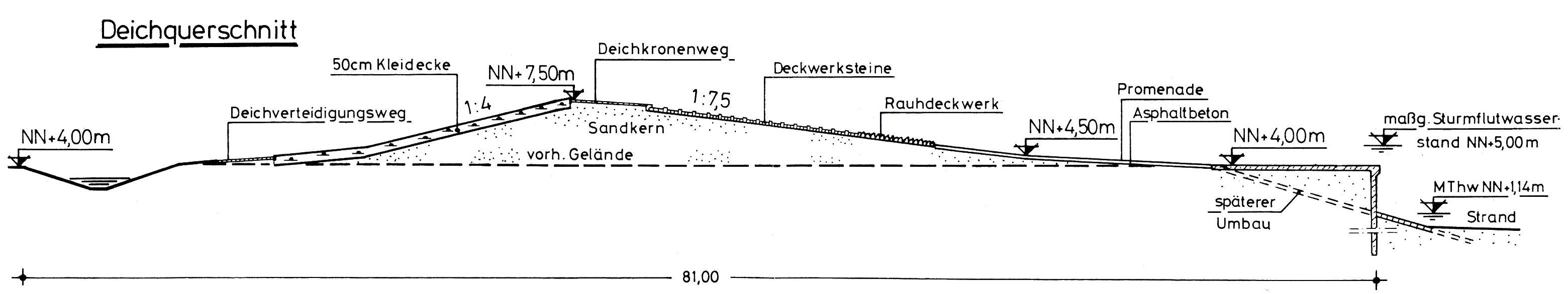 Der 1. Bauabschnitt am Hafen wurde bereits 1980 fertiggestellt. Dabei sind die Straßen von und zum Hafen auf die neue Deichhöhe angehoben worden. Im z. Bauabschnitt wird 1981 der erforderliche Sand in ein Spülfeld in der rd. 1 km langen Trasse des Westdeiches eingespült. Dieser Sand wird von einem Saugbagger mit Schneidkopf auf der Robbenplate gegenüber der Marienhöhe gewonnen und mit einer Dükerleitung durch das rd. 20 m tiefe Norderneyer Seegat auf die Insel gefördert.